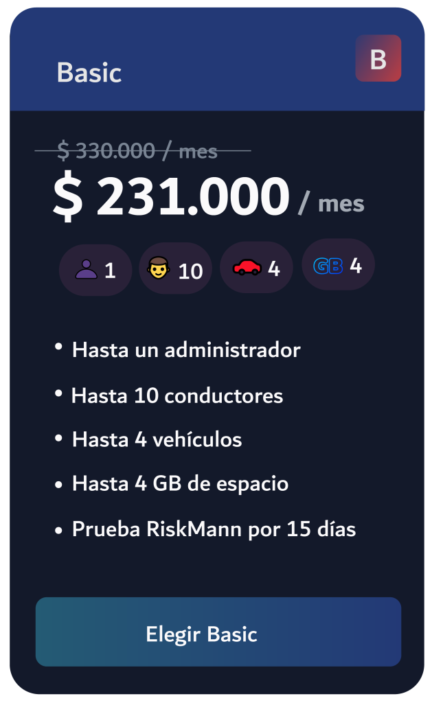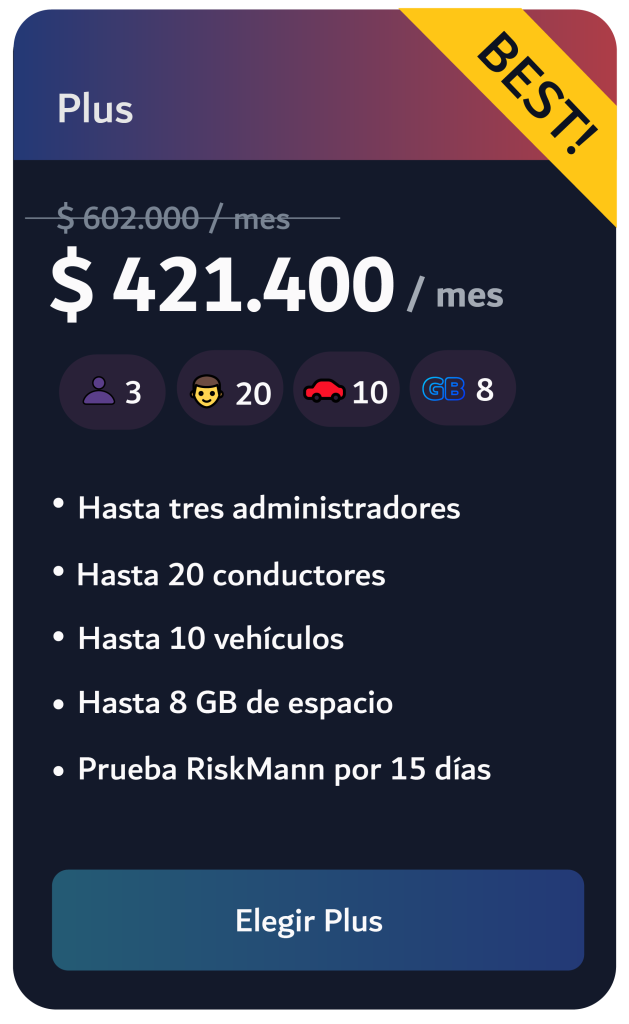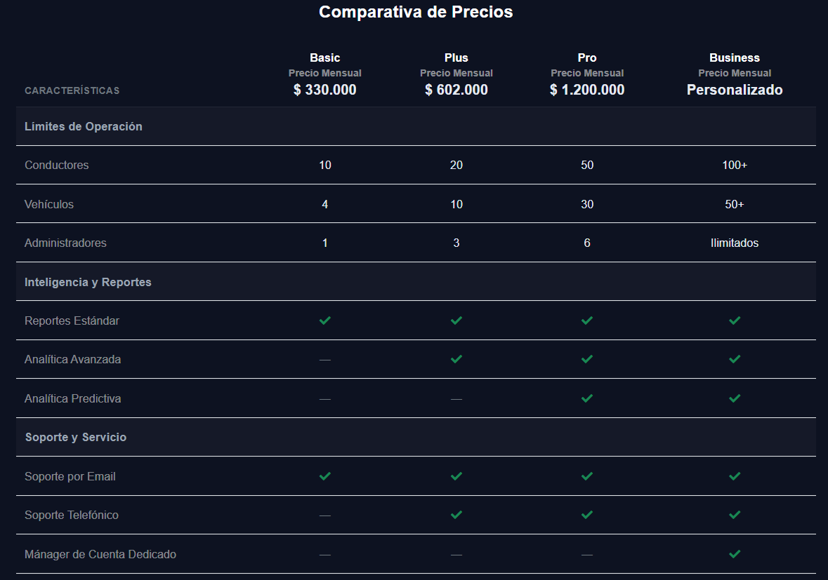 Descubre el plan perfecto para tu empresa y garantiza el cumplimiento del PESV (Ley 769 de 2002 Código de Tránsito) sin complicaciones. Todos nuestros planes incluyen acceso completo a nuestra plataforma, soporte experto y actualizaciones constantes según la normativa.