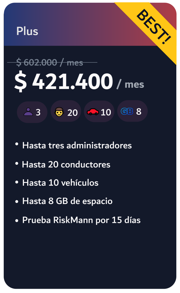Descubra el plan perfecto para su empresa y garantice el cumplimiento del PESV (Ley 769 de 2002 Código de Tránsito) sin complicaciones. Todos nuestros aviones incluyen acceso completo a nuestra plataforma, soporte experto y actualizaciones constantes según la normativa.